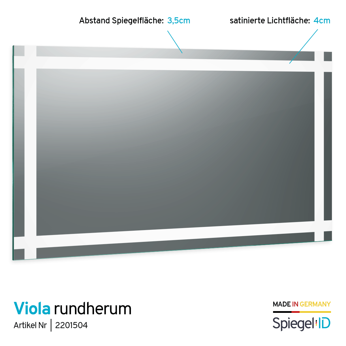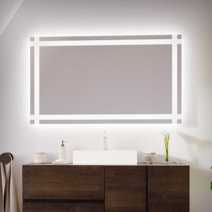 Der Badezimmerspiegel Viola verkörpert sowohl Eleganz als auch Funktionalität, wodurch er sich nahtlos in jedes Badezimmer einfügt. Erschaffen Sie eine natürliche Atmosphäre mit der individuell konfigurierbaren LED Beleuchtung, die je nach Bedarf zwischen warmem und kühlem Licht variiert. Die überkreuzenden, satinierten Lichtflächen bieten nicht nur eine bessere Sicht während Ihrer täglichen Pflege, sondern auch ein kristallklares Spiegelbild. Ergänzt durch klarpolierte Kanten und ein edles Design, wird Viola zum zentralen Blickfang Ihres Badezimmers. Dank seiner maßgeschneiderten Größe und der hochwertigen Verarbeitung bleibt dieser Spiegel ein dauerhaftes Highlight, das in Funktionalität und Design überzeugt. Lassen Sie Ihr Badezimmer mit dem Badspiegel Viola in neuem Glanz erstrahlen.