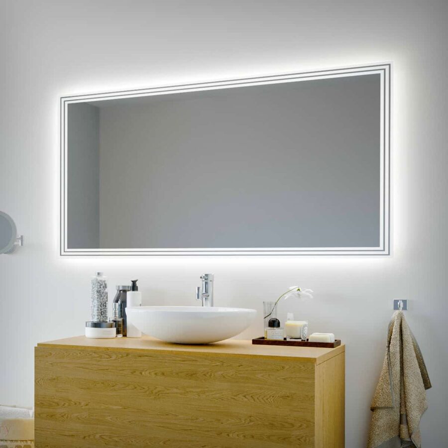 Der Badspiegel Arella vereint Stil, Eleganz und Funktionalität, um Ihr Badezimmer oder jeden anderen Raum in ein wahres Schmuckstück zu verwandeln. Seine rundherum integrierte LED Beleuchtung sorgt nicht nur für optimale Lichtverhältnisse beim Schminken oder Rasieren, sondern schafft auch eine angenehme Atmosphäre und optische Wärme. Dies verbessert nicht nur Ihr Raumgefühl, sondern bietet Ihnen auch ein unvergleichliches Spiegelerlebnis. Das zeitlose Design, gekennzeichnet durch klarpolierte Kanten und einen brillanten Innenrahmen aus mattiertem Licht, setzt elegante Akzente. Jeder Spiegel wird individuell nach Maß gefertigt, wodurch er sich perfekt in verschiedene Raumkonzepte, sei es Badezimmer, Gäste-WC oder gar Wohnzimmer, einfügt. Dank seiner sauberen Verarbeitung können Sie sich auf einwandfreie Reflexionen und ein perfektes Spiegelbild verlassen. Mit dem Badspiegel Arella wählen Sie nicht nur einen praktischen Alltagsbegleiter, sondern auch ein exklusives Designelement für Ihr Zuhause.