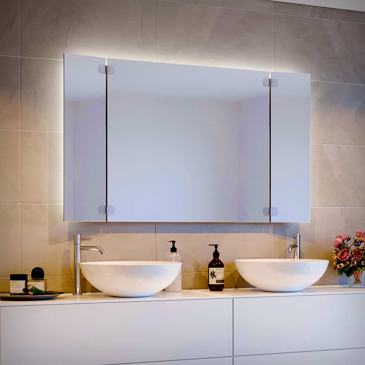 Der Klappspiegel Aurea besticht mit seiner puren Schlichtheit und einer unaufdringlichen Hintergrundbeleuchtung, die Ihr Gesicht sanft umschmeicheln wird. Kristallklare Spiegelfläche und Seitenelemente nach Maß sorgen dafür, dass Sie Ihr Äußeres zu jeder Tages- und Nachtzeit perfekt im Griff haben.